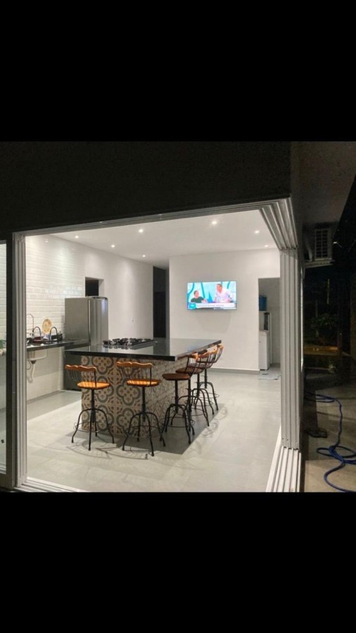 Sala de jantar integrada à cozinha gourmet, equipada com ilha, fogão embutido e churrasqueira;